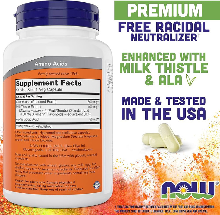 مکمل گلوتاتیون 500 میلی گرم ناو فودز حاوی شکل فعال (reduced form) گلوتاتیون است. این محصول علاوه بر گلوتاتیون، حاوی عصاره خار مریم (Milk Thistle Extract) و اسید آلفا لیپوئیک (Alpha Lipoic Acid) نیز می باشد.